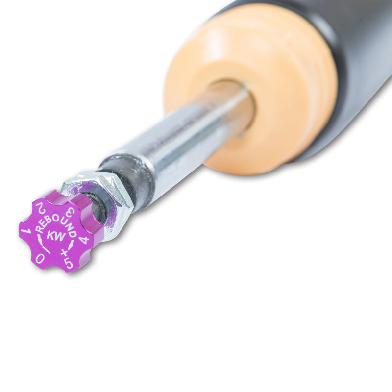 Is your factory sport suspension too firm? Do you want a sporty look and driving dynamics without having to compromise comfort? KW V2 comfort coilovers take the already stellar ride and reputation of KW suspensions coilover systems to the next level of comfort. Designed specifically to maximize comfort KW V2 Comfort coilovers provide a subtle lowering with adjustable ride height and rebound damping adjustability allowing the handling or the comfort to be individually tailored as desired via the integrated rebound adjustment knobs. KW V2 Comfort coilovers offer the perfect compromise of driving dynamics and ride comfort. With the KW V2 Comfort coilover kit, your comfort-oriented driving pleasure is the focus. That's why our test engineers evaluate the setups on numerous highways and country roads with various road surface types. The KW V2 Comfort coilover kits are suitable for all drivers who want to combine the joy of a decent lowering with driving comfort. With the 16-click adjustable rebound damping (TVR-A-technology), you can tune the KW dampers on the KW V2 Comfort coilover kits to make it more comfortable or sportier. The two-stage, patented TVR-A (Twin Valve Rebound - Adjustable) technology enables a small volume of oil to flow through an adjustable, conically shaped, low-speed bypass during low damper speeds, while in the case of higher damper speeds, the main rebound stage valve opens allowing a larger volume of oil to flow. This provides a big improvement in terms of ride comfort without influencing the safety-relevant high-speed range. There are 16 precise clicks available for individual settings, so you can choose between more comfort or more body control. The KW V2 Comfort coilovers, made using INOX-LINE stainless steel technology, enables a vehicle-specific lowering within the tested adjustment range of 10 to 40 mm.