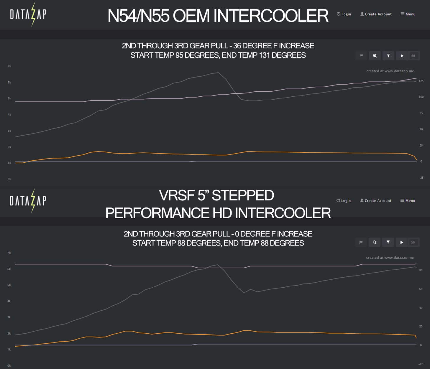 The VRSF Performance HD Intercooler is comprised of an incredibly dense fin pack both internally and externally. It’s not uncommon to see intake temperatures drop at the end of a 3rd gear pull due to the Performance HD’s larger overall surface area. You can expect to see an intake temperature reduction on a stock turbo, full bolt on car during a 3rd gear pull which is why we the Performance HD is THE best option for your N55. Please note that the HD fin pack is now standard at no extra charge!